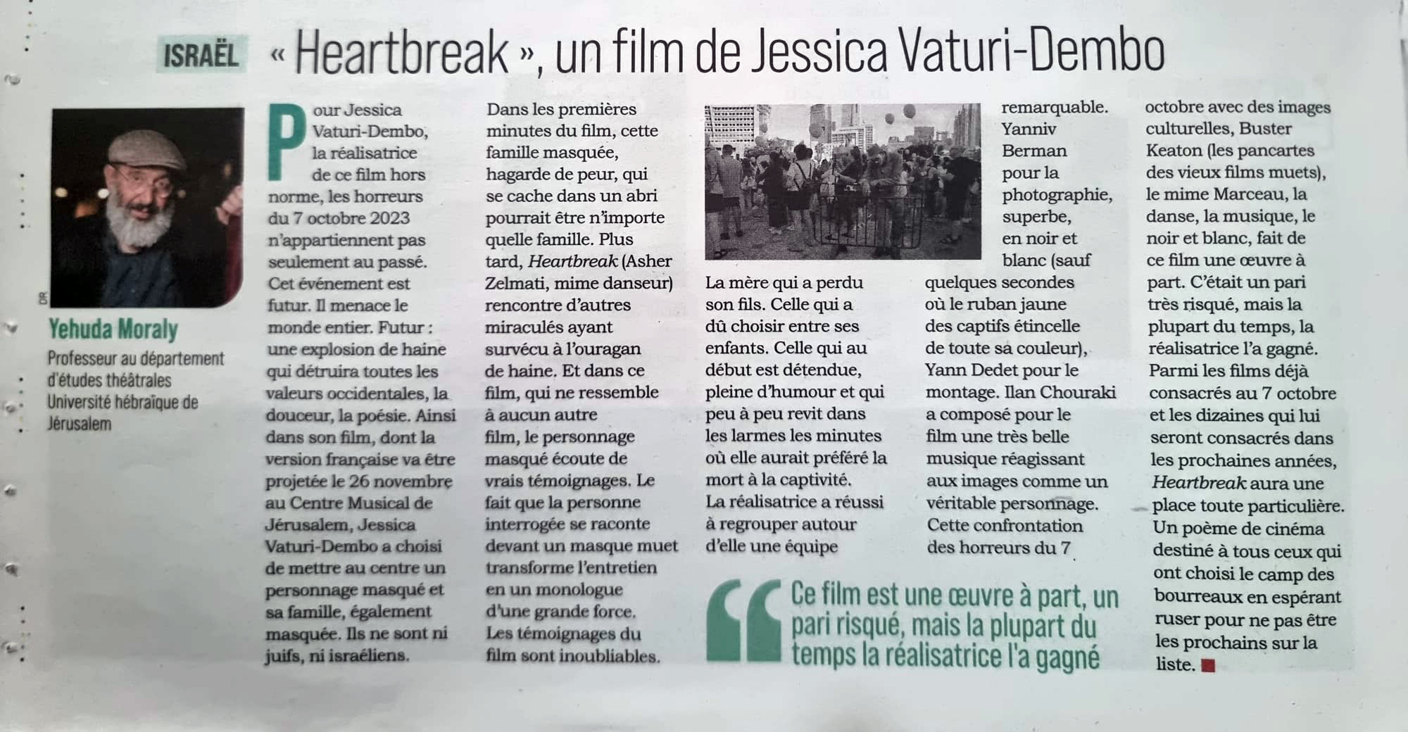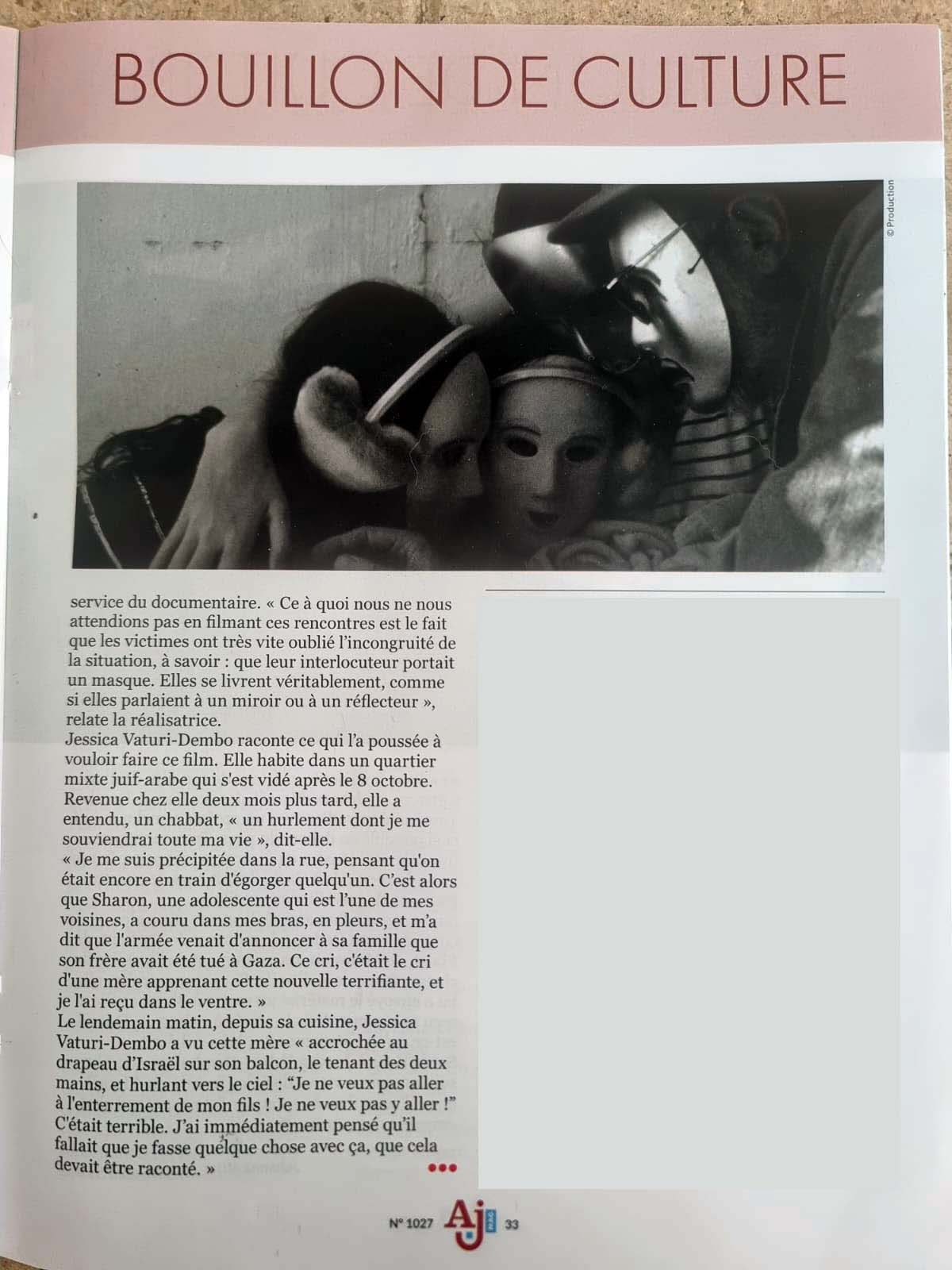 D’octobre 2023 à octobre 2024 je vivais en Israël où mon fils avait émigré. J’étais donc sur place, le 7 octobre. Le film est né d’un cri déchirant, une nuit de décembre 2023. J’ai couru jusqu’à la rue, croyant qu’on égorgeait à nouveau quelqu’un. Une adolescente en pleurs s’est précipitée dans mes bras. C’était Sharon, la fille de ma voisine. Sa mère venait de pousser le cri terrible d’une femme à qui est annoncé la mort de son fils, tué dans l’explosion d’une bombe. Le film lui est dédié.